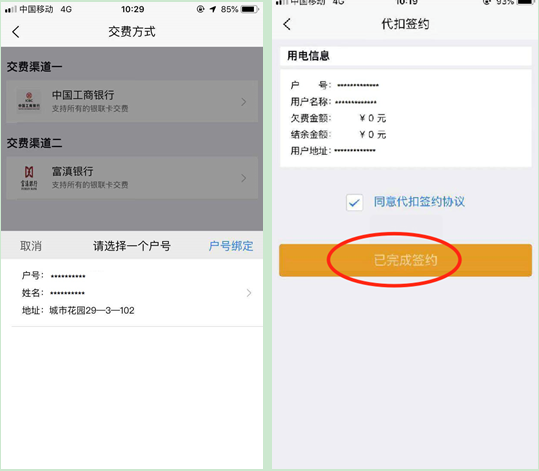 2.按照系统提示完成用户“代扣签约”即用户户号与银行卡绑定。如果已经完成签约,按钮则显示“已经完成签约”。
